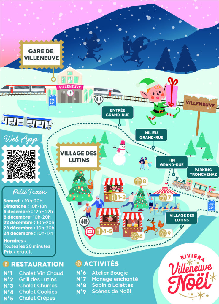 Cette année, profitez d’un voyage en petit train pour vous déplacer gratuitement de la gare de Villeneuve au Village de Lutins en desservant les arrêts suivants :