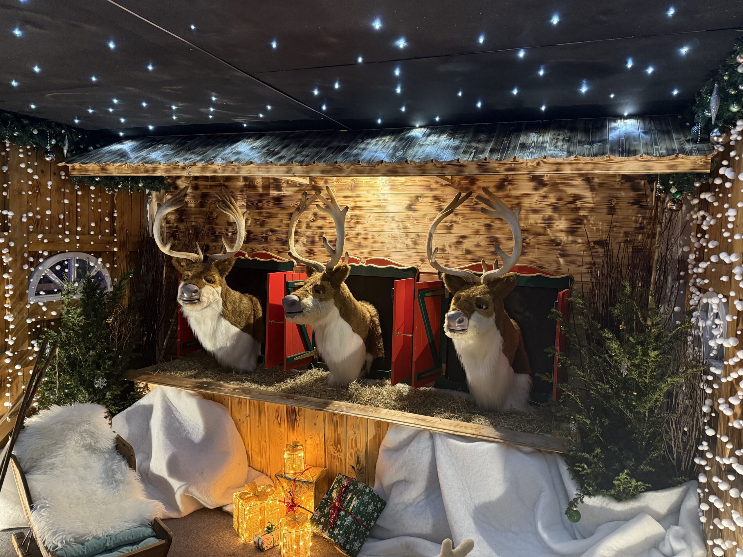 À deux pas, la Forêt des Rennes dévoile les majestueux compagnons du Père Noël, s’entraînant à tirer son traîneau sous la neige.