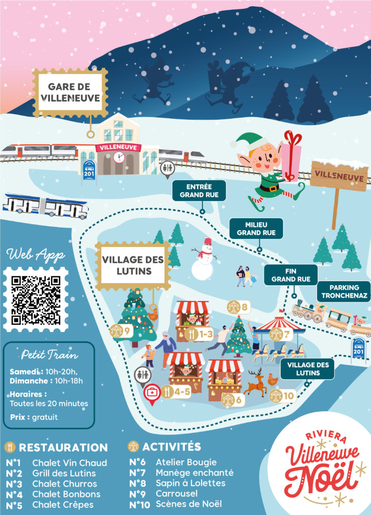 This year, enjoy a ride on the little train to travel free of charge from Villeneuve station to the Village de Lutins , stopping at the following locations: